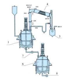- 1、反應鍋 2、豎式分餾 3、豎式冷 4、臥式冷 5、貯水器 6、稀釋釜 7、粗濾 8、精濾